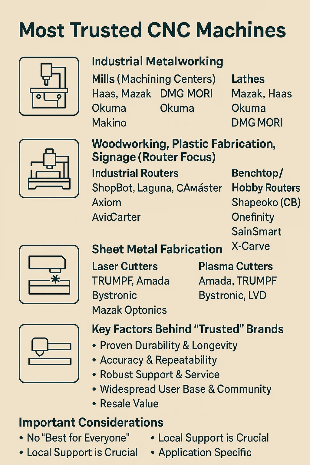 • Промышленные металлообрабатывающие предприятия: Доверие означает мощные машины, которые работают круглосуточно и без выходных в течение многих лет с минимальными усилиями. Бренды, известные своей надежностью в обрабатывающих центрах с ЧПУ (фрезерных станках) и токарных центрах с ЧПУ (токарных станках), часто возглавляют список заводов.
