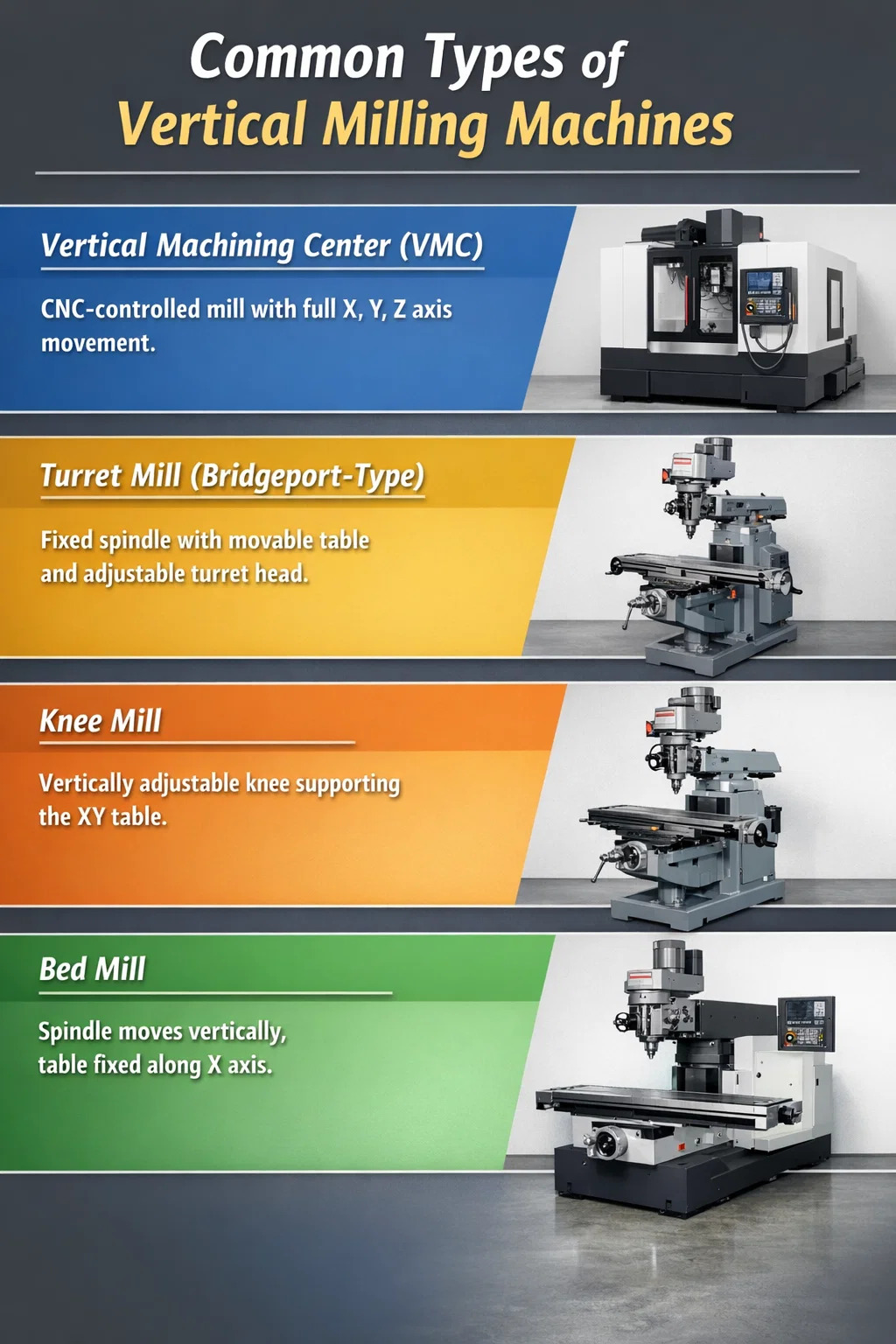 Вертикально-фрезерный станок чаще всего называют вертикальный обрабатывающий центр (ВМК) . Ее также называют револьверной мельницей, коленной мельницей или мельницей типа Бриджпорт, в зависимости от ее конкретной конструкции и конфигурации. В эпоху ЧПУ термин «вертикальный обрабатывающий центр» стал доминирующим отраслевым обозначением, в то время как «револьверная фреза» и «коленная фреза» продолжают обозначать отдельные механические варианты. Понимание этих названий и того, что отличает один тип от другого, является первым шагом к выбору подходящей машины для конкретного применения.