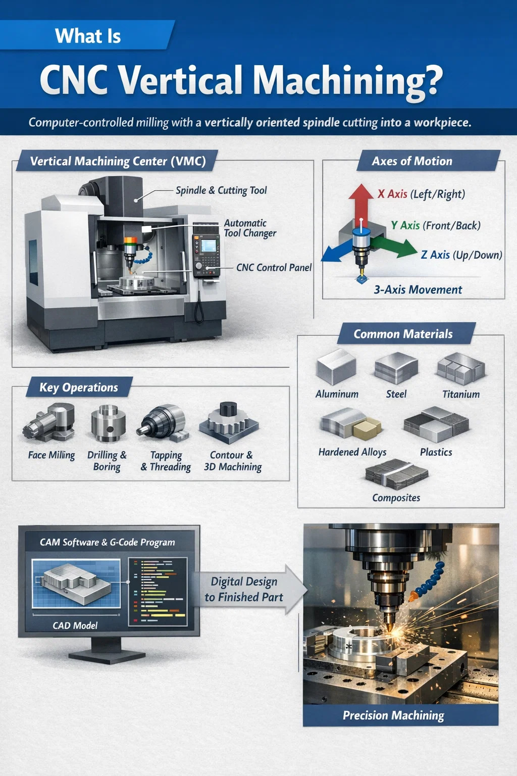 Вертикальная обработка с ЧПУ — это субтрактивный производственный процесс, в котором станок с числовым программным управлением использует вертикально ориентированный шпиндель для перемещения вращающихся режущих инструментов вниз к заготовке, неподвижно удерживаемой на горизонтальном столе. Машина считывает цифровую программу — обычно G-код — и преобразует эти инструкции в точные, повторяемые движения по нескольким осям, удаляя материал для получения желаемой формы, элемента или качества поверхности.