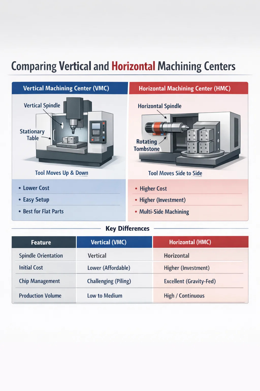 Это структурное различие приводит к значительным различиям в эвакуации стружки, производительности детали и общей стоимости. Хотя VMC более распространены из-за их меньшие первоначальные инвестиции и простота установки , HMC превосходно справляются с крупносерийным производством и сложными многосторонними задачами обработки.