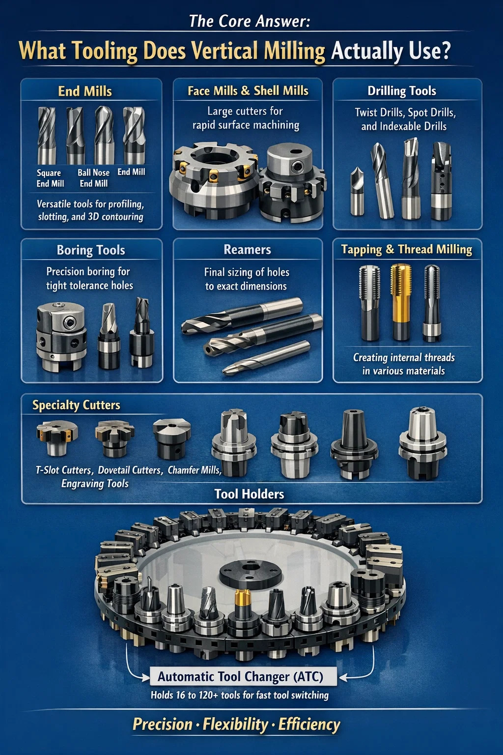 Вертикальное фрезерование основано на широком семействе вращающихся режущих инструментов, установленных на шпинделе, который движется перпендикулярно рабочему столу. Наиболее часто используемый инструмент включает концевые фрезы, торцевые фрезы, сверла, расточные оправки, развертки, метчики и пазовые сверла. О современном Вертикальные обрабатывающие центры (ВМК) Эти инструменты загружаются в карусель автоматического устройства смены инструмента (ATC), которая может вмещать от 16 до 120 инструментов, что позволяет выполнять сложные многооперационные детали за одну установку.